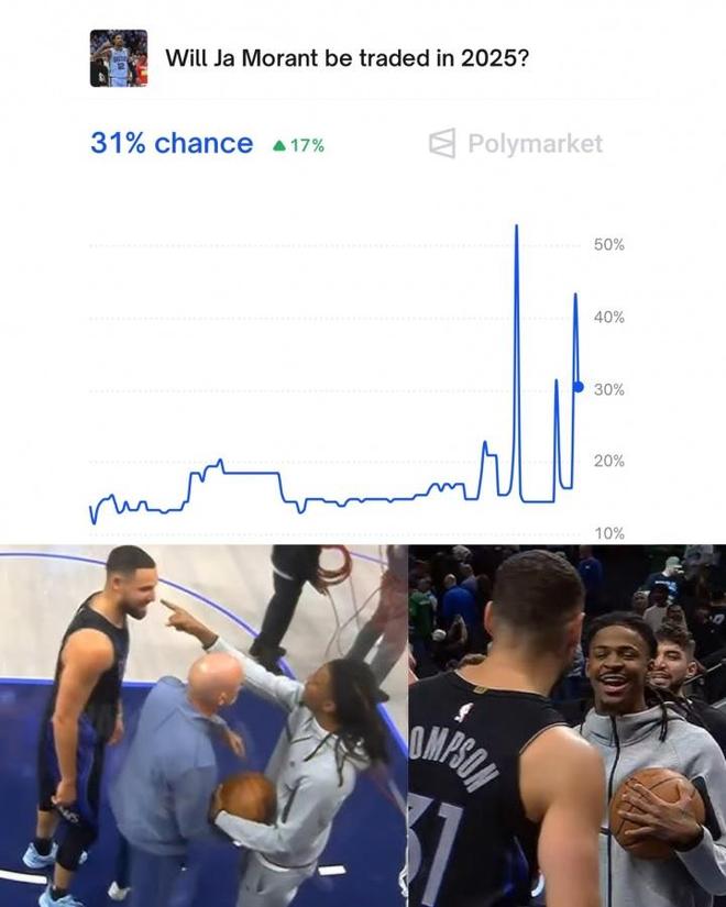 这件事情的影响还在持续发酵。据美媒Polymarket Sports的专业预测,在和克莱发生冲突之后,莫兰特在2025年被交易的概率飙升至31%。这一数据的大幅上升,反映出了此次冲突事件对莫兰特未来职业生涯的巨大影响。要知道,在职业体育的世界里,球员的场外形象和行为举止往往会对球队的决策产生重要影响。球队不仅要考虑球员的竞技水平,还要考虑其是否能够融入团队文化,是否会给球队带来不必要的麻烦。